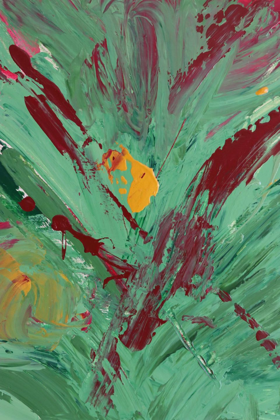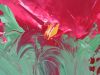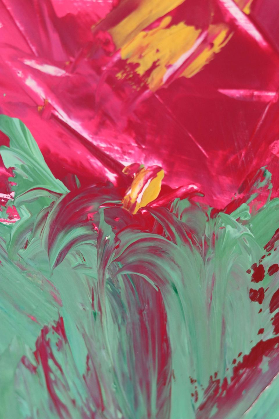 This piece captures the passionate energy of the hibiscus flower through explosive brushwork and layered textures. Shades of crimson, maroon, and gold bloom freely across the canvas, grounded by lush, expressive greens.