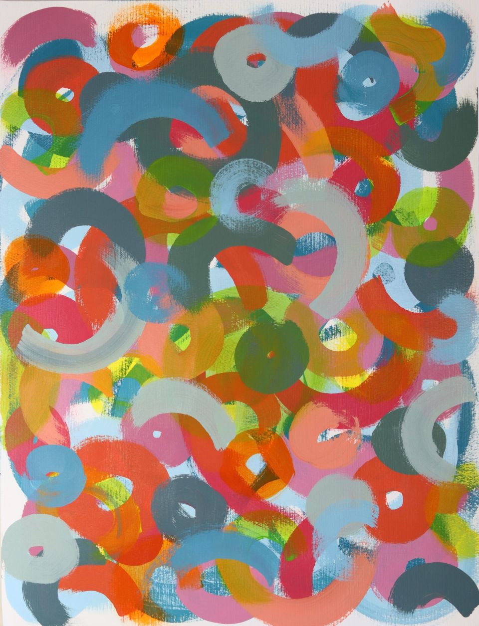 The composition features layered brushstrokes, fluid forms, and tangled loops that symbolize the internal chaos of healing, survival, and sensory overload. Rich in emotion and storytelling, it invites viewers into a world where time and perception become abstract.