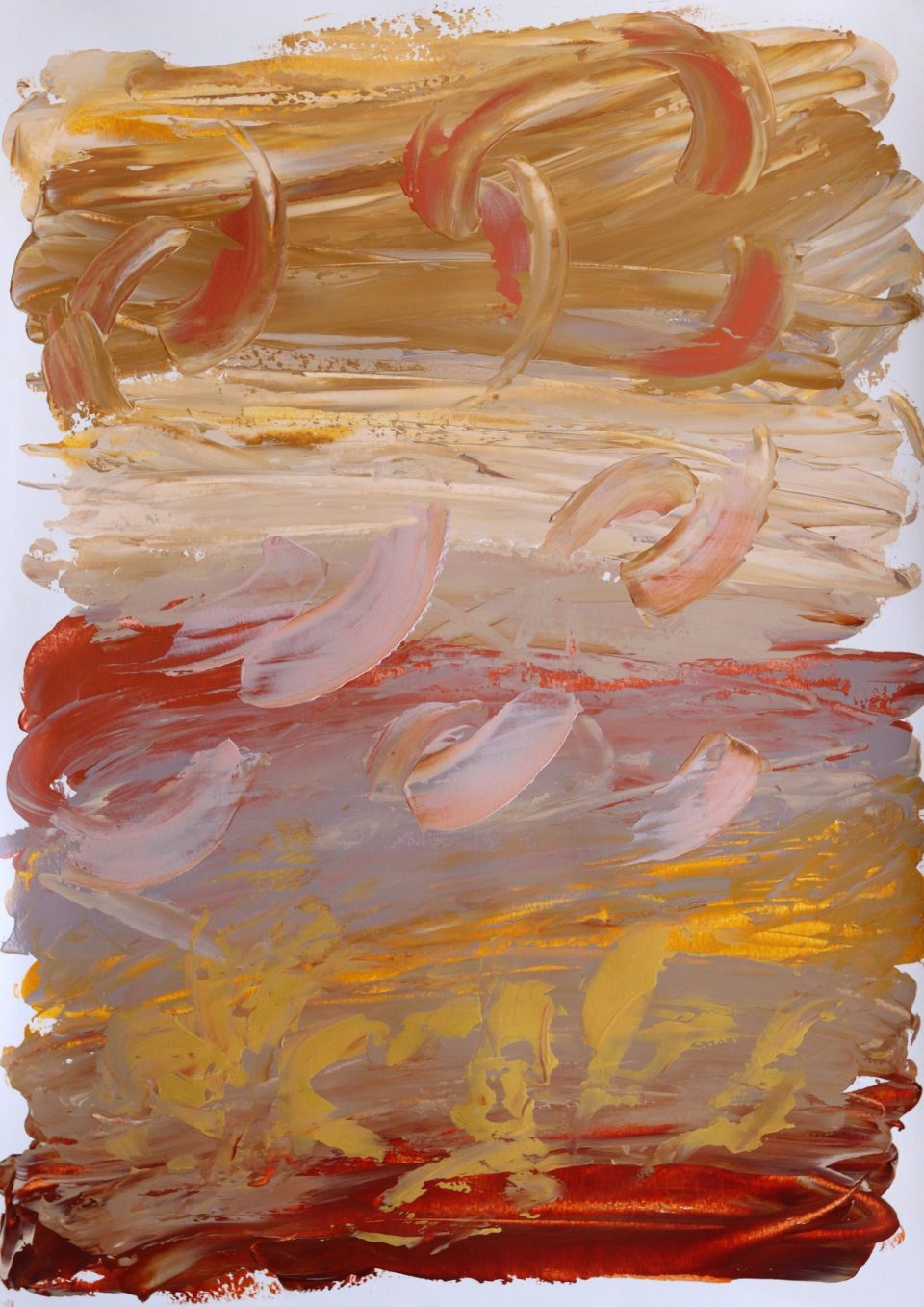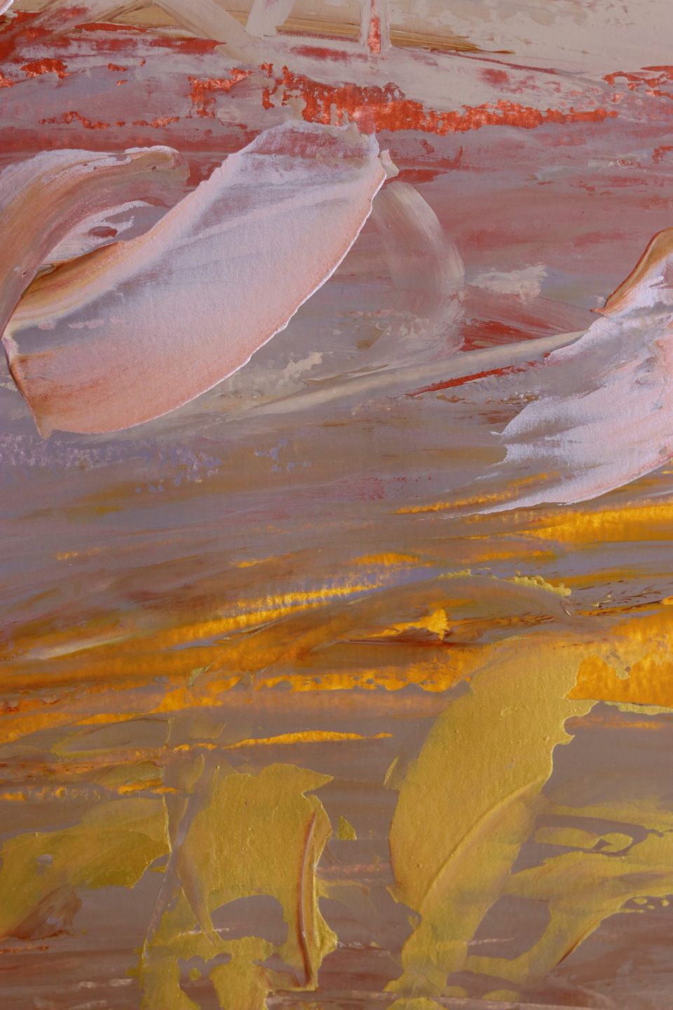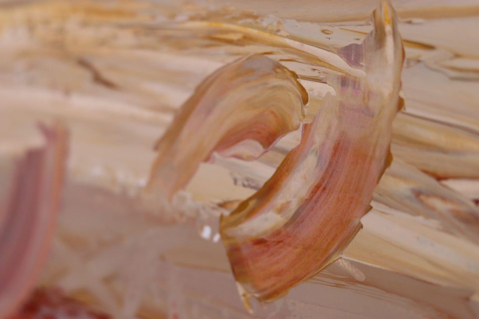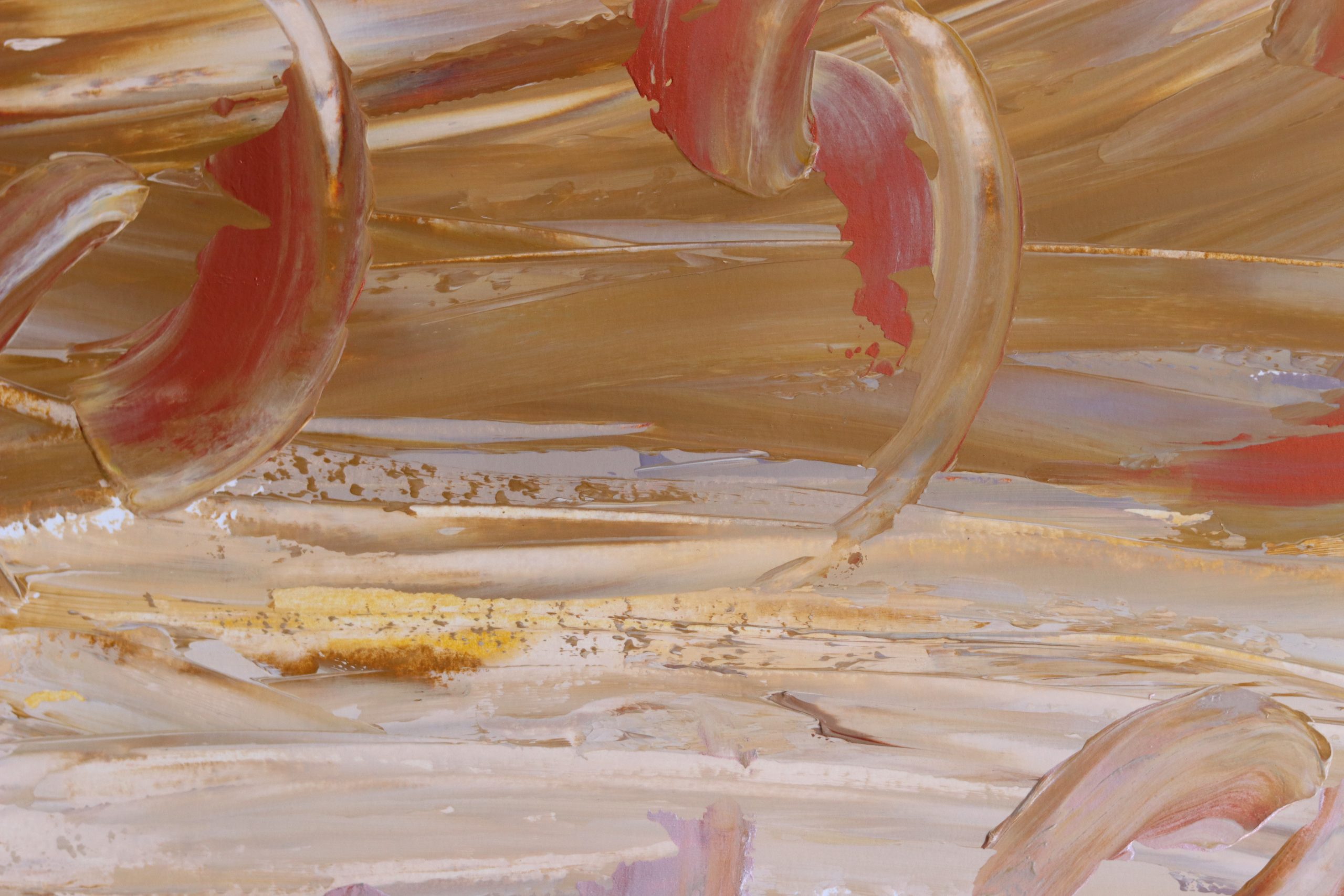 The piece is a contemporary abstract painting that draws on personal memory, cultural heritage, and the imagined landscapes of the Libyan desert. With soft swirls of gold, beige, and cream, the composition evokes the textures of all colors of sand and the delicate beauty of traditional glass-bottled souvenirs—symbols of a place deeply connected to the artist’s roots.