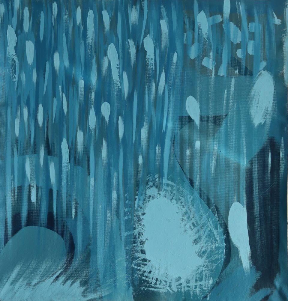 The background is covered in blues of raw acrylic, The brush is held aggressively, letting the mind flow — as chaos is something familiar state to my brain expressing it in colors and shapes as much as it reduces my anxiety it also increase it in the same time when I figure out that I’m able to see the chaos outside of my brain.