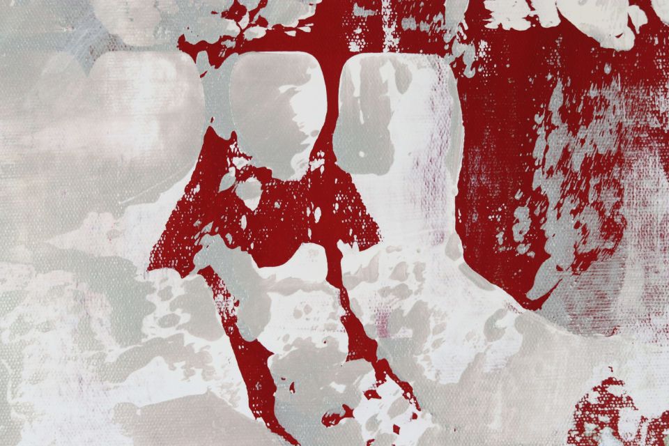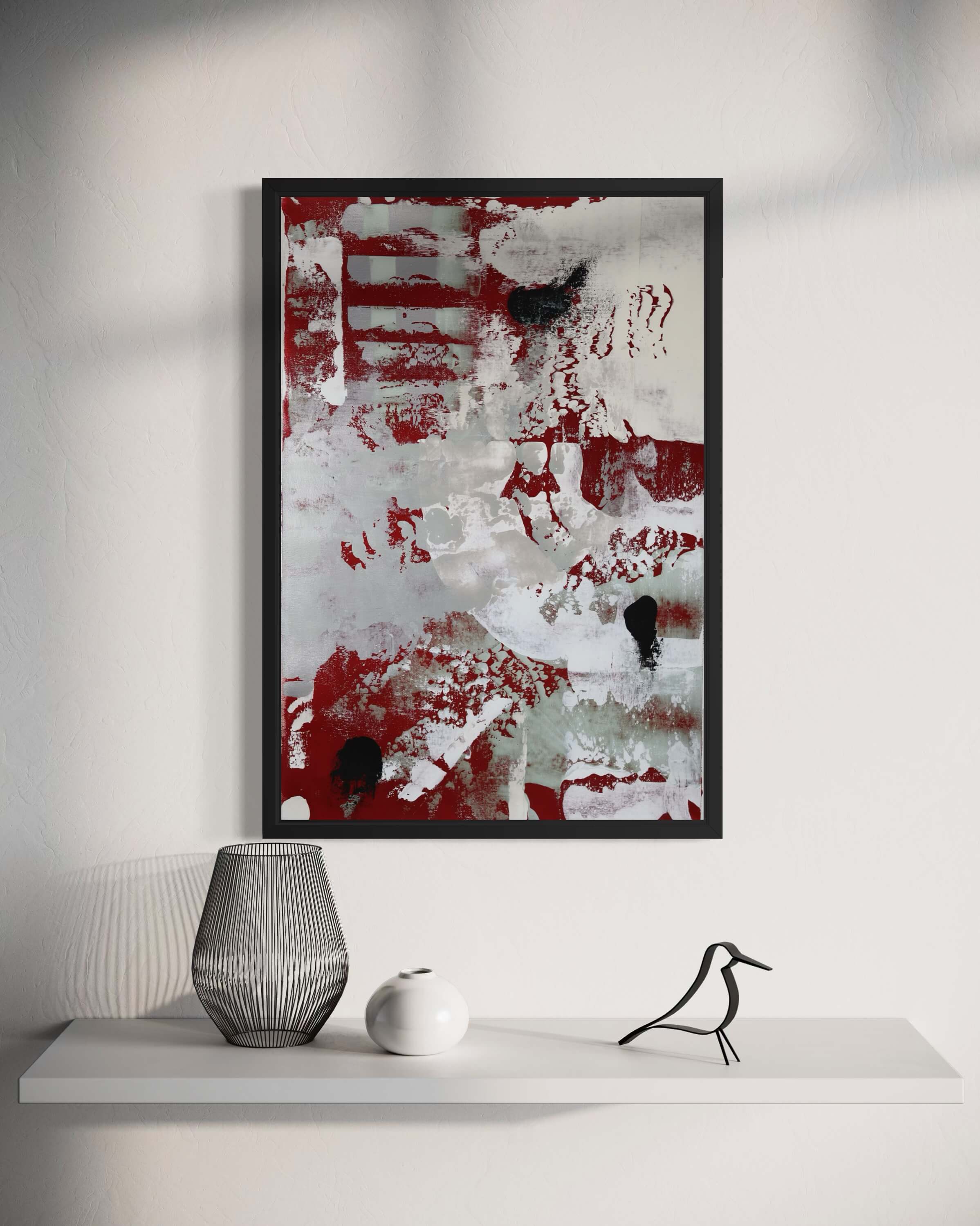 While Civil War (A) holds the explosion of conflict, Civil War (B) leans into the aftermath—the haunting quiet that follows chaos. Layers of red, black, and ghostly white move across the canvas like whispers of broken buildings, lost voices, and cities learning how to survive themselves.