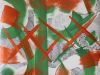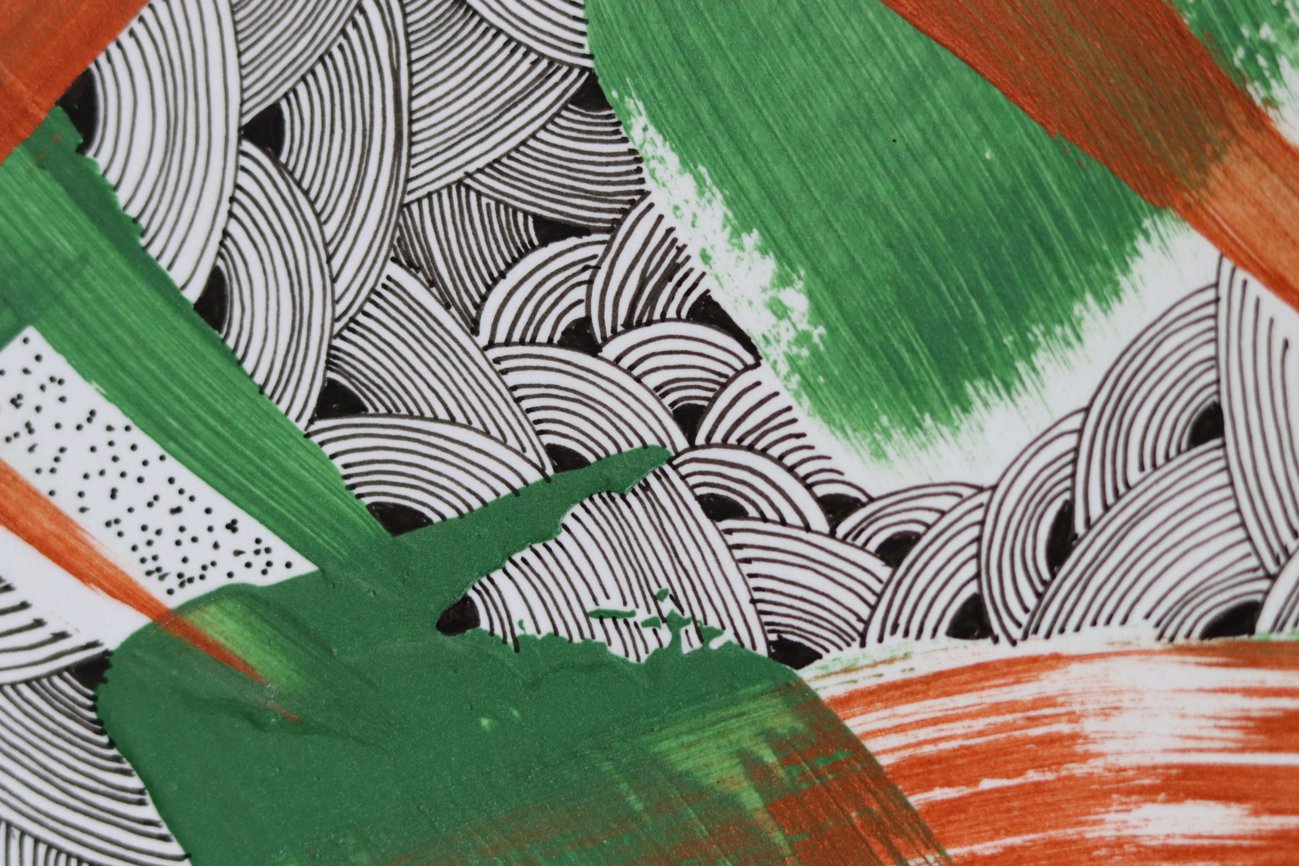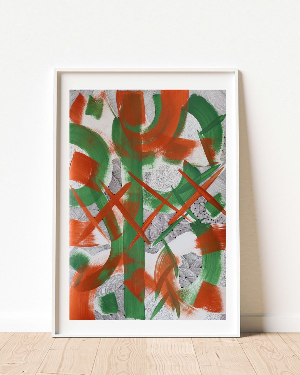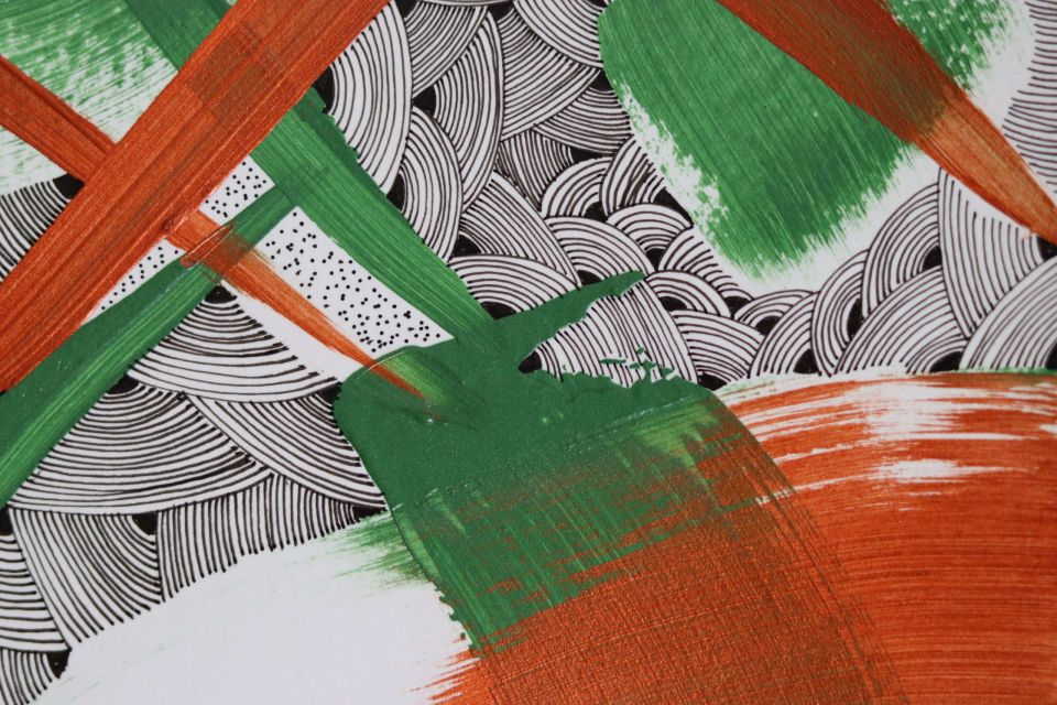 The piece is layered with vibrant green and earthy orange acrylic strokes applied freely over a monochrome base, revealing a composition of internal conflict and silent intensity. Every mark, curve, and cross speaks of emotions buried deep — a personal landscape shaped by memories, stories untold, and intuitive gestures that refuse to be silenced.