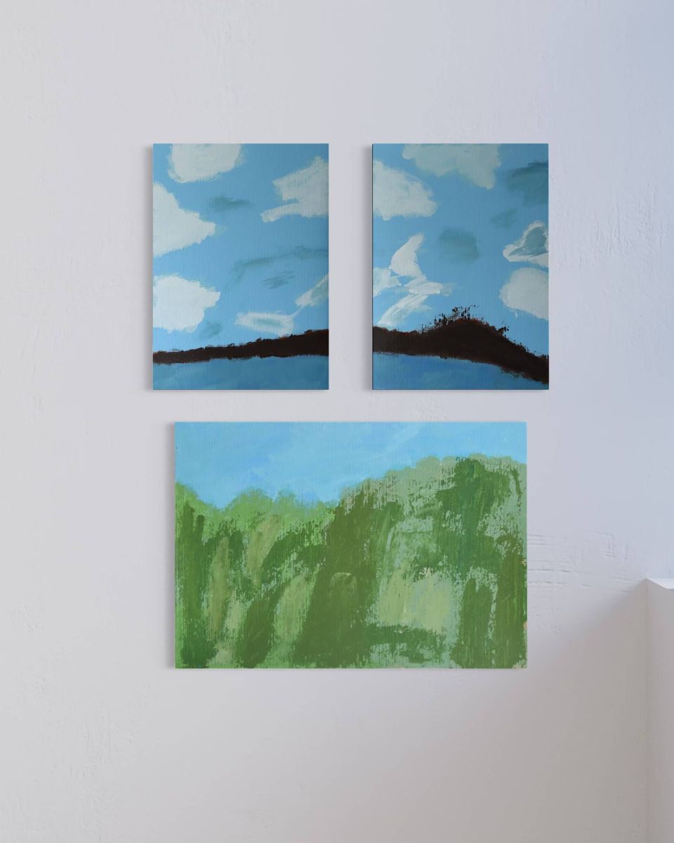 With a soft yet abstract combination of sky blues, cloud whites, grass greens, and earthy browns, this piece evokes a sense of serenity and tranquility at first glance. But beneath its calm surface lies a quiet mystery—a story untold, a place unnamed.