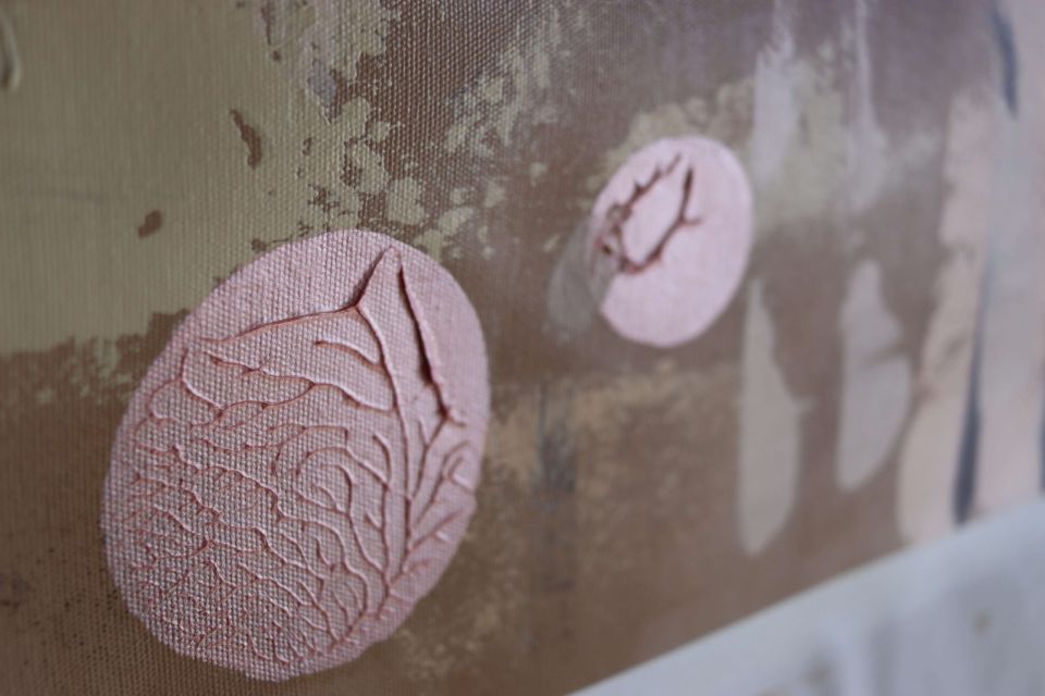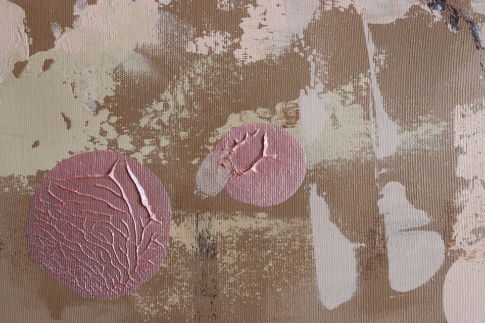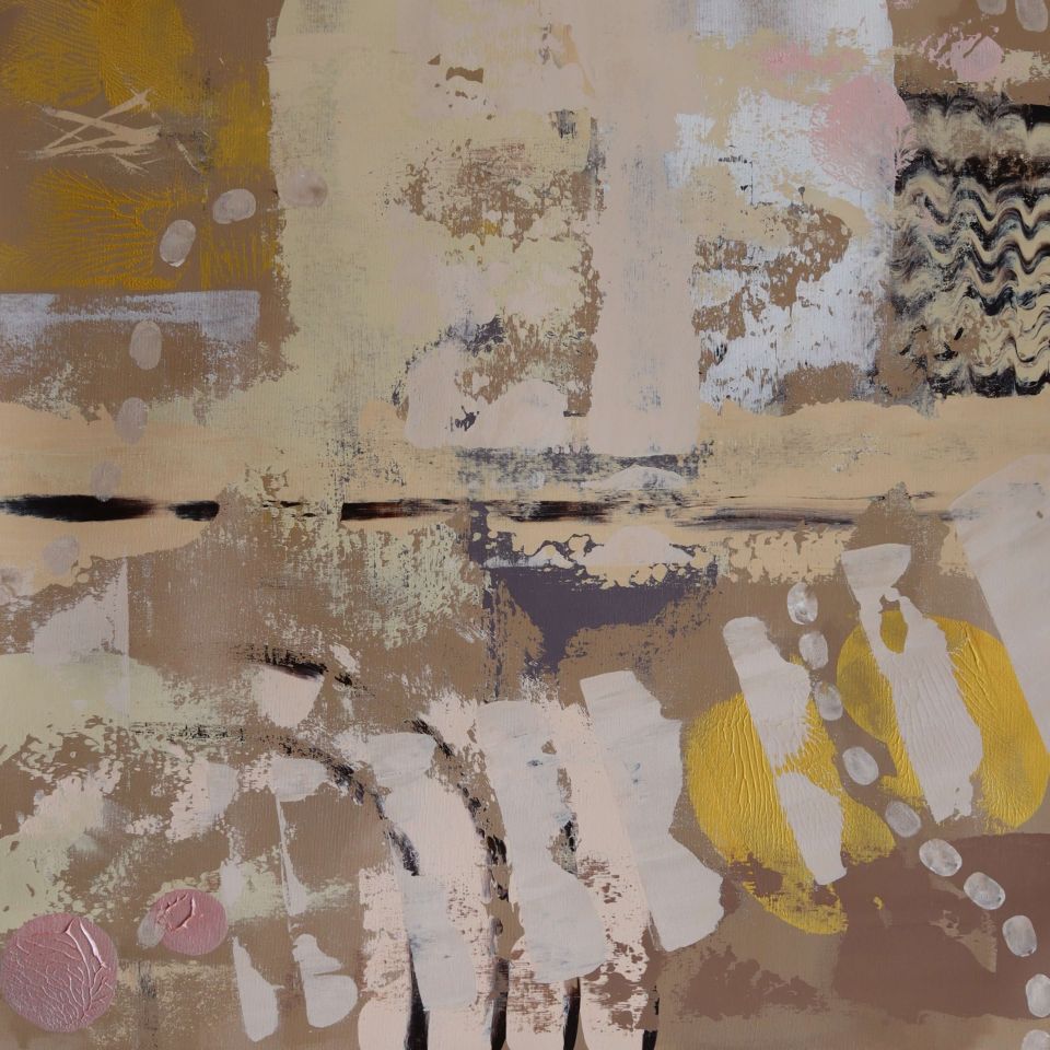 Its muted, earthy palette meets unexpected textures—fingerprints, smears, pressed patterns—that make the invisible visible. This work is a simple expression of a complicated inner storm.